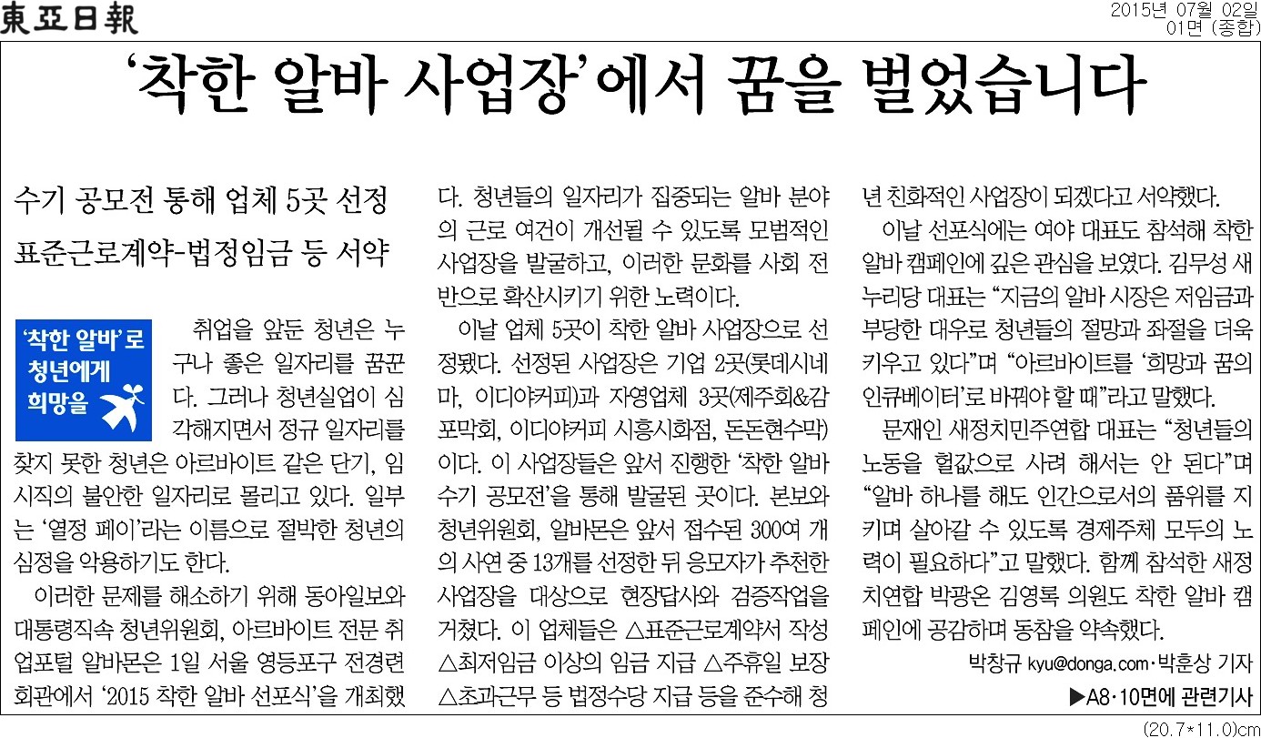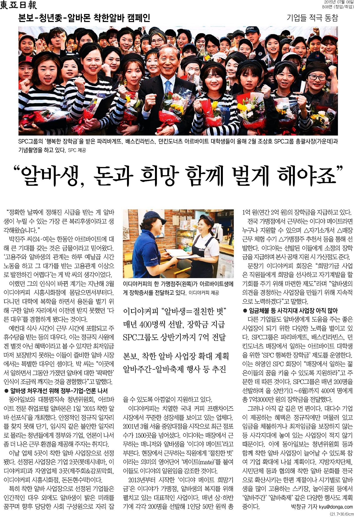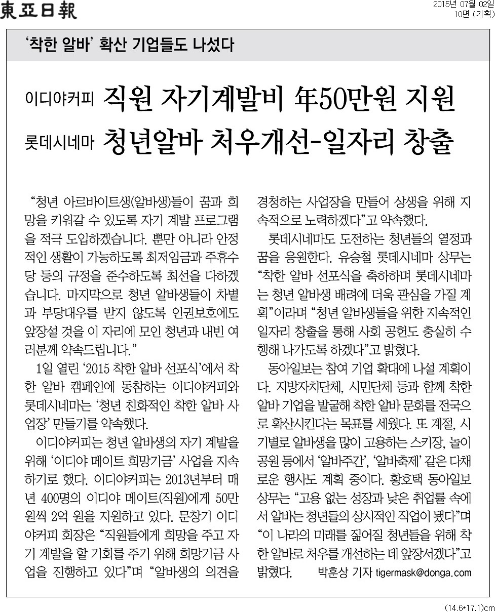 이디야커피의  <2015 착한 알바 선포식> '착한 알바 사업장' 선정 소식이 동아일보에 보도되었습니다.