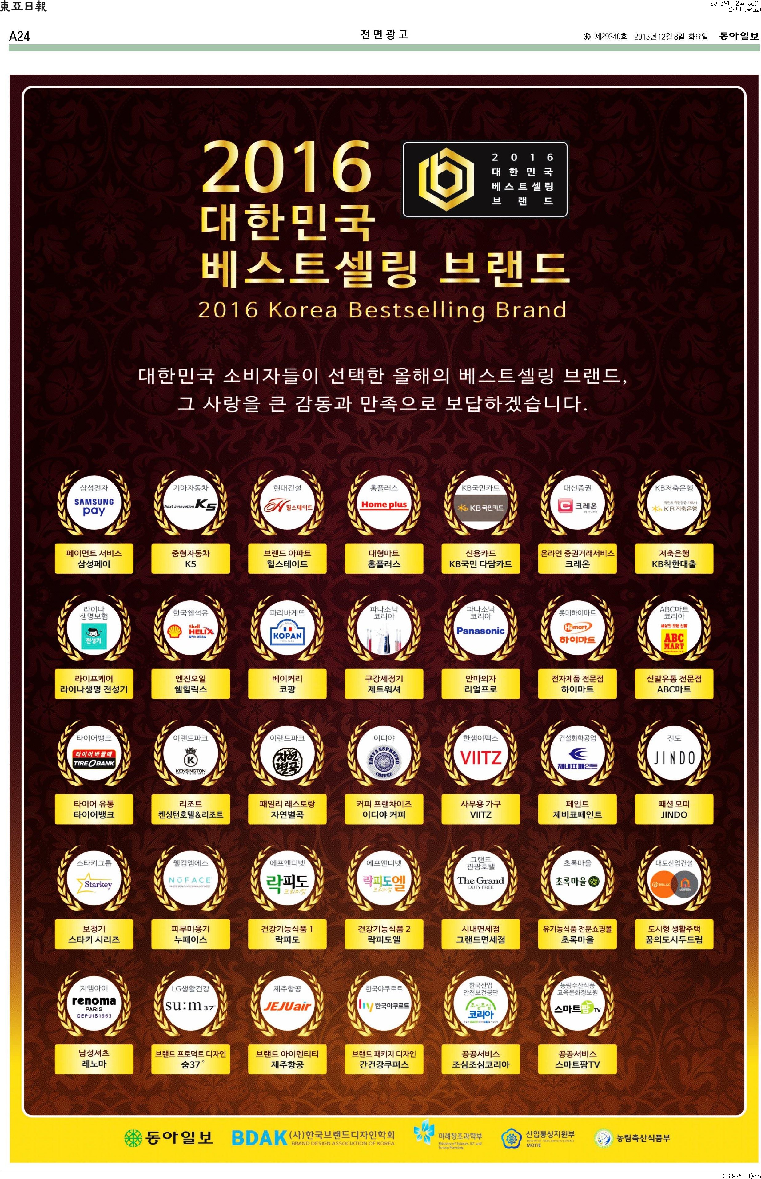 이디야커피가 동아일보와 한국브랜드디자인학회가 선정한 '2016 베스트셀링 브랜드' 34개 중 커피 프랜차이즈 부문을 차지하였습니다.