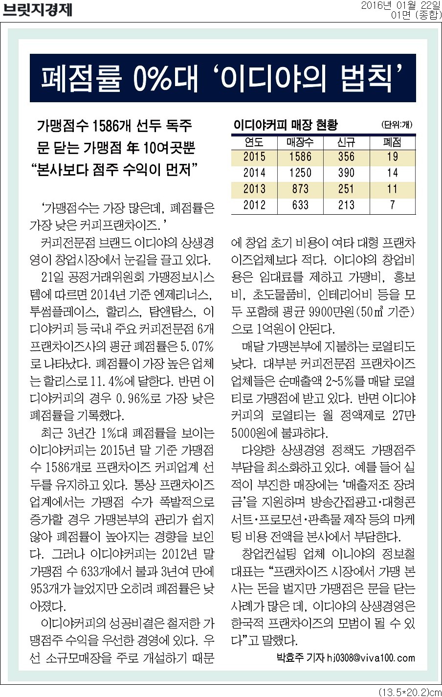 국내 최다 가맹점에도 불구하고 가장 낮은 폐점률을 자랑하는 이디야커피의 상생경영에 대해 1월 22일자 브릿지경제(종합1면)에 보도되었습니다.