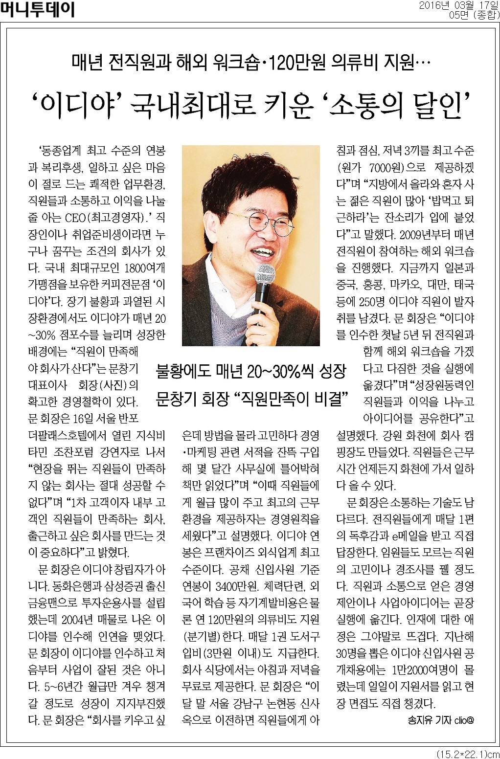 이디야커피 문창기 회장의 지식비타민 조찬포럼 연설이 머니투데이에 보도되었습니다.