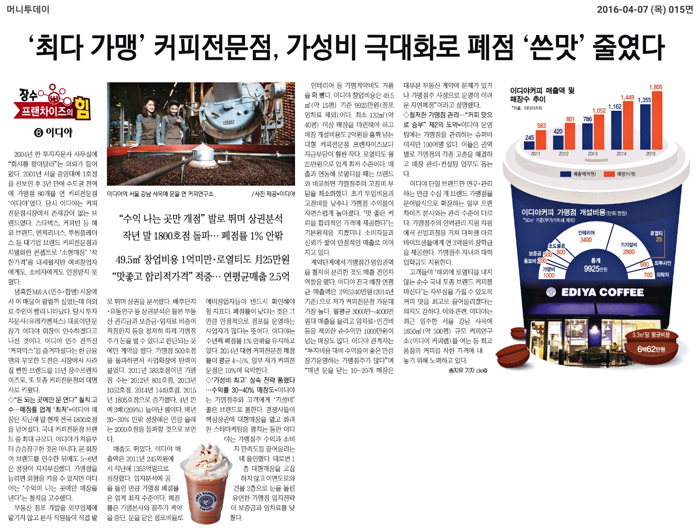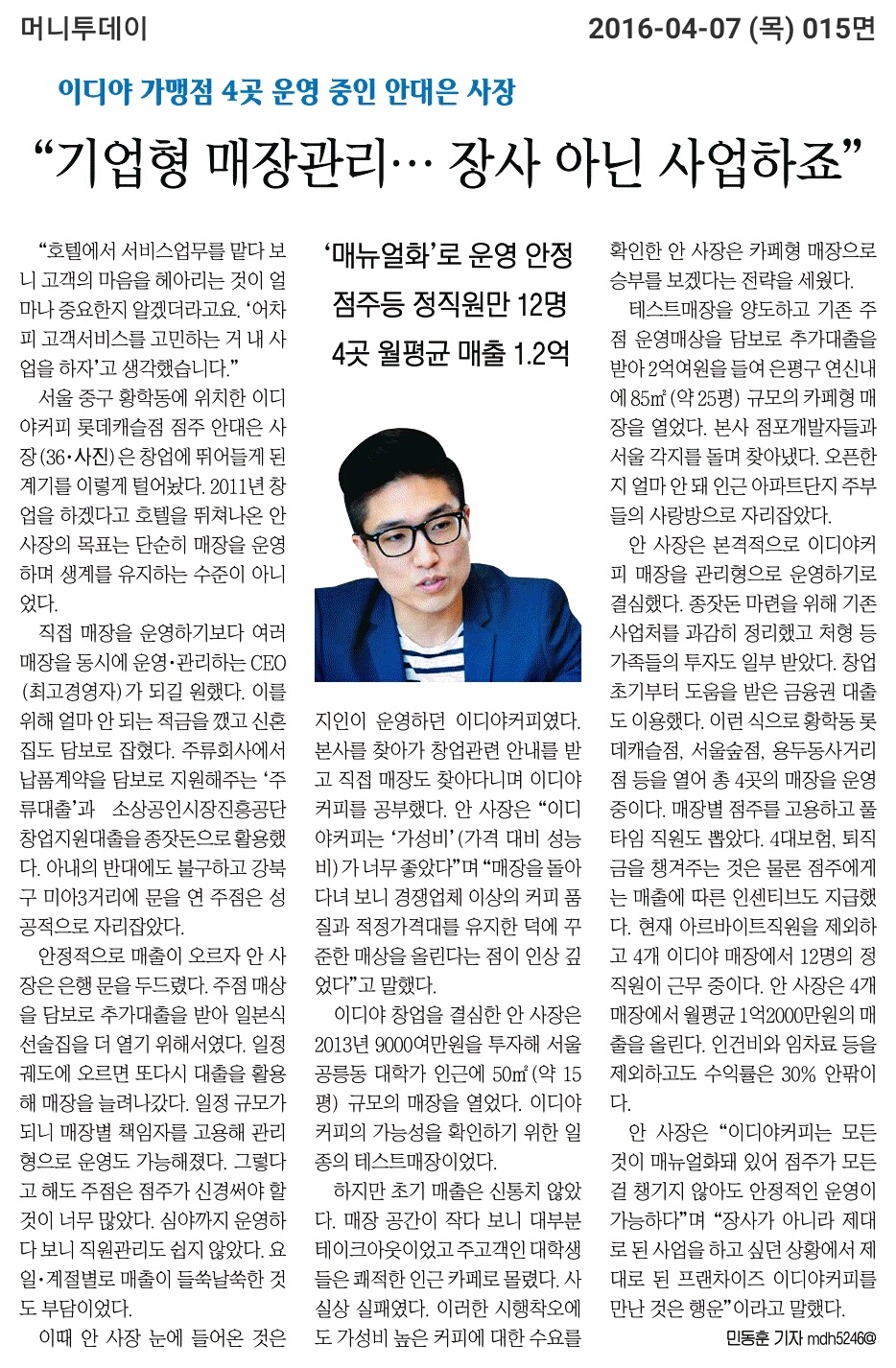 이와 함께 이디야커피 가맹점을 4곳 운영중인 안대은 사장에 대한 인터뷰도 함께 실렸습니다.