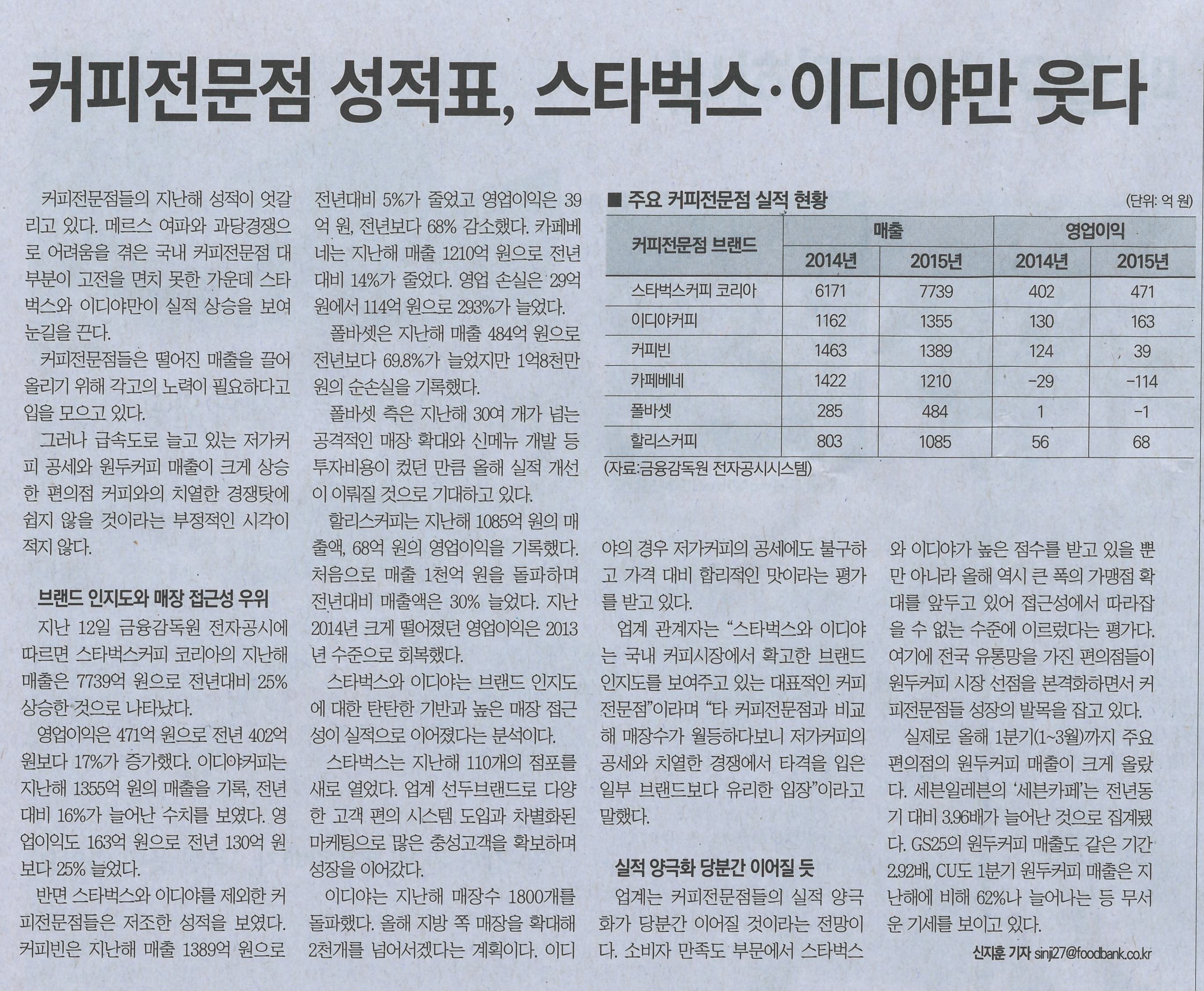 ■ 기사명 : 커피전문점 성적표, 스타벅스 이디야만 웃다