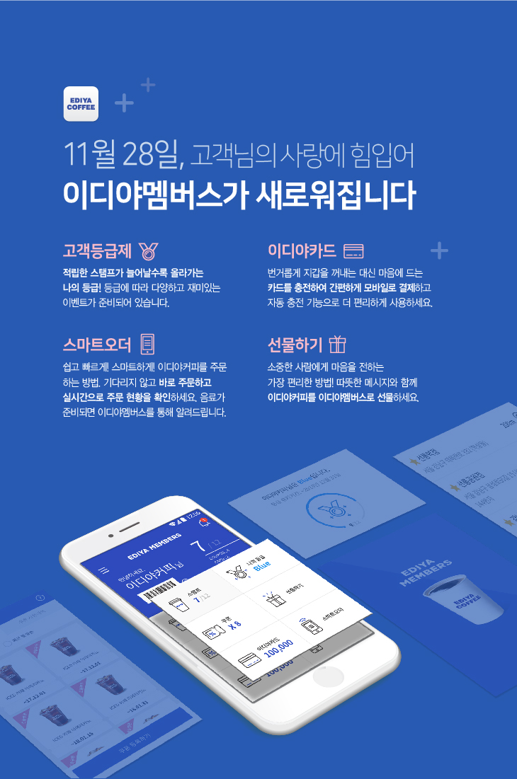 추가되는 고객등급제, 이디야카드, 스마트오더, 선물하기를 확인하세요.​